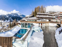 One of the most beautifully situated hotels in the Alps. The hotel offers a new wellness area and outdoor pool (only in summer). Swimming area is free for all hotel guests. Sauna and wellness area €15 per person over 17 years per visit. Parking approx. 200m from the main building. Aparthotel Goldried Park, 1'000 m a.s.l., surrounded by trees. Above Matrei in Osttirol, on a slope, 1 km from the skiing area. For shared use: lawn for sunbathing, swimming pool (seasonal availability: 01.Jun. and 30.Sep.). Children's playground. In the complex: reception, restaurant, bar, WiFi, sauna (extra). Spa area (extra), billiard table, playroom, lift, central heating system, washing machine. Breakfast and half board possible on request. Motor access to the house. Communal covered parking. Shop 850 m, supermarket 1 km, restaurant, café 200 m, bus stop Matrei in Osttirol Mittelschule 900 m. Gondola lift 1 km, skisport facilities 1 km. Hiking paths: Nationalpark Hohe Tauern. Partly elevator! Half board per child 2-5 years €14.29 per day / FR per child 2-5 years €4.57 per day.